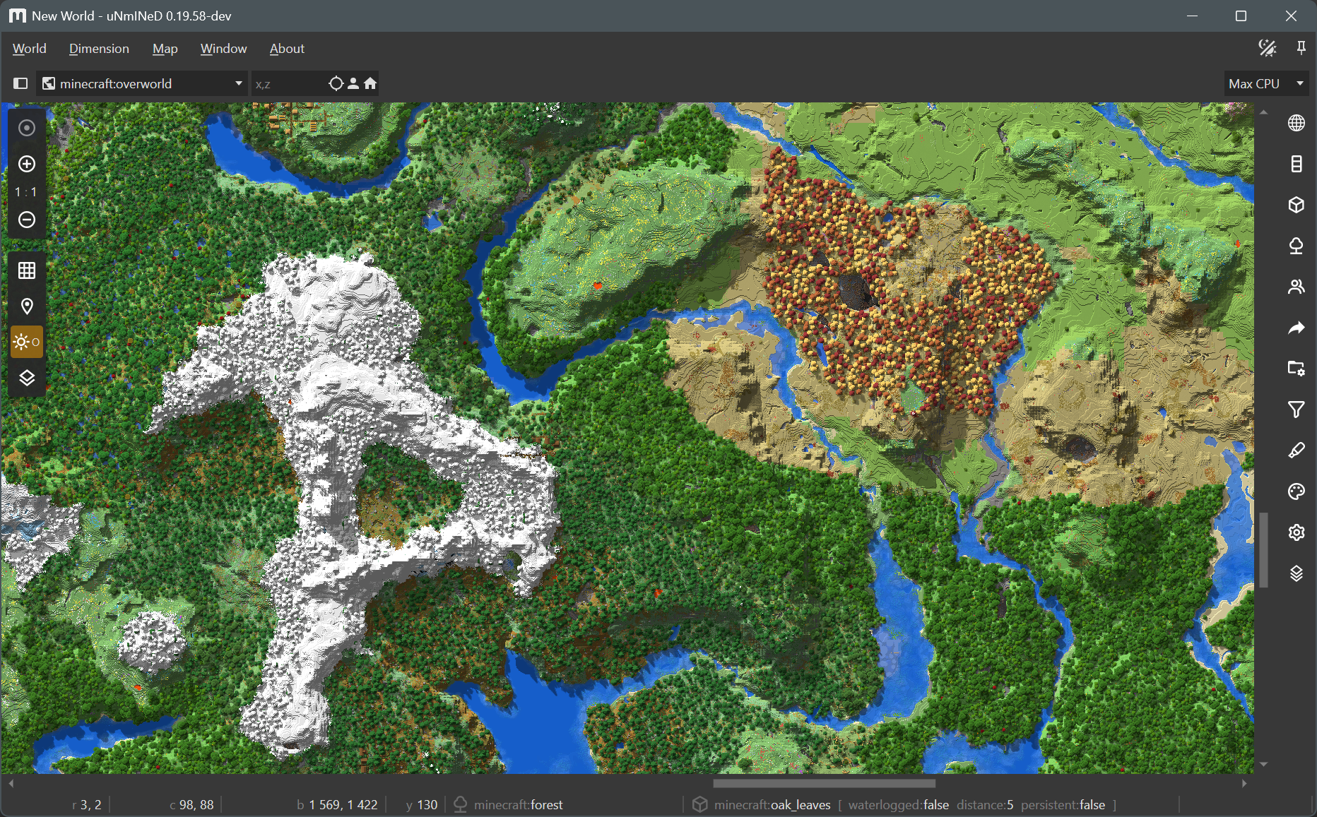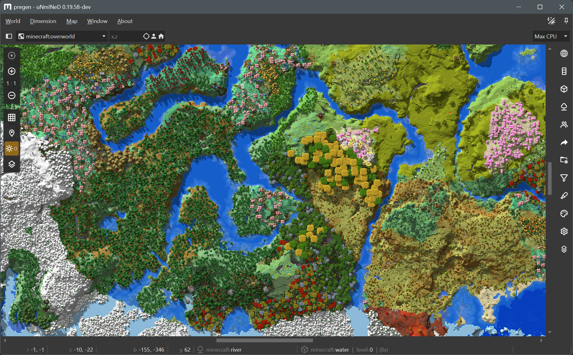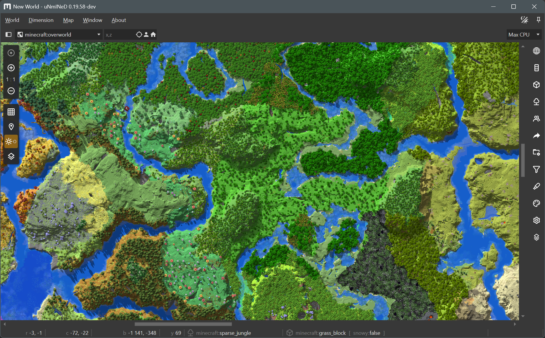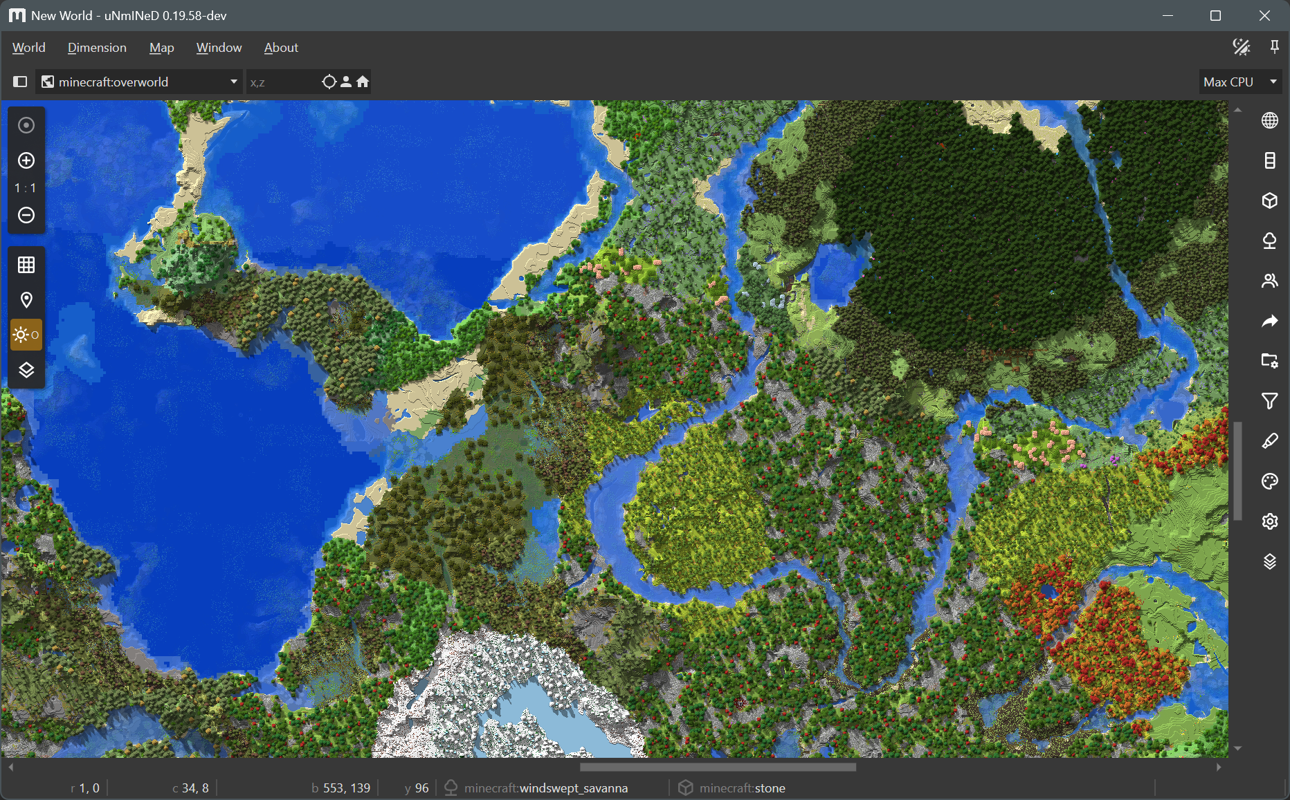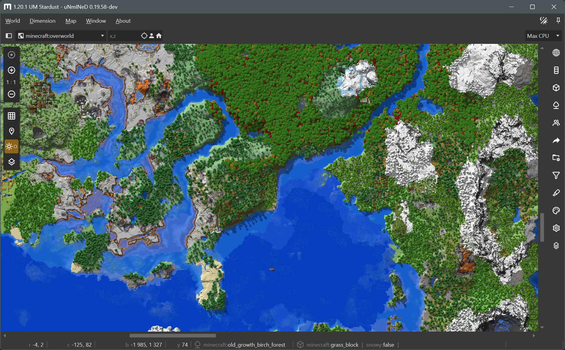 uNmINeD now can read biome and block metadata from datapacks/mods and behavior/resource packs, and it calculates map colors for custom blocks automatically by averaging their textures instead of displaying them as pink.